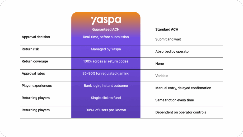 Instead of initiating blindly and waiting to see what happens, a guaranteed solution checks whether the funds are actually there. If they are, the deposit proceeds and the outcome is guaranteed, even across the ACH settlement window. Yaspa holds that guarantee for the operator, so the two to three day clearing period becomes irrelevant to your operations. If the funds aren’t there, the transaction doesn’t go forward. No one is chasing a return.