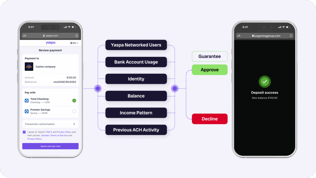 High approval rates. Yaspa targets approval rates of 85 to 90% for regulated gaming, well above the 60 to 70% average acceptance rates often seen with traditional guaranteed ACH providers. Instead of relying on blunt risk rules or batch reviews, Yaspa makes real-time, AI-driven decisions on every payment attempt, helping operators approve more players with confidence without increasing return risk.